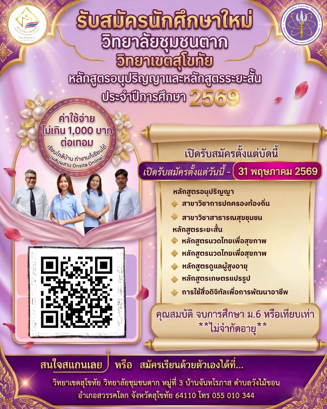 วิทยาเขตสุโขทัย วิทยาลัยชุมชนตาก รับสมัครนักศึกษาใหม่หลักสูตรอนุปริญญา ปีการศึกษา2569 ภาคการศึกษา 1