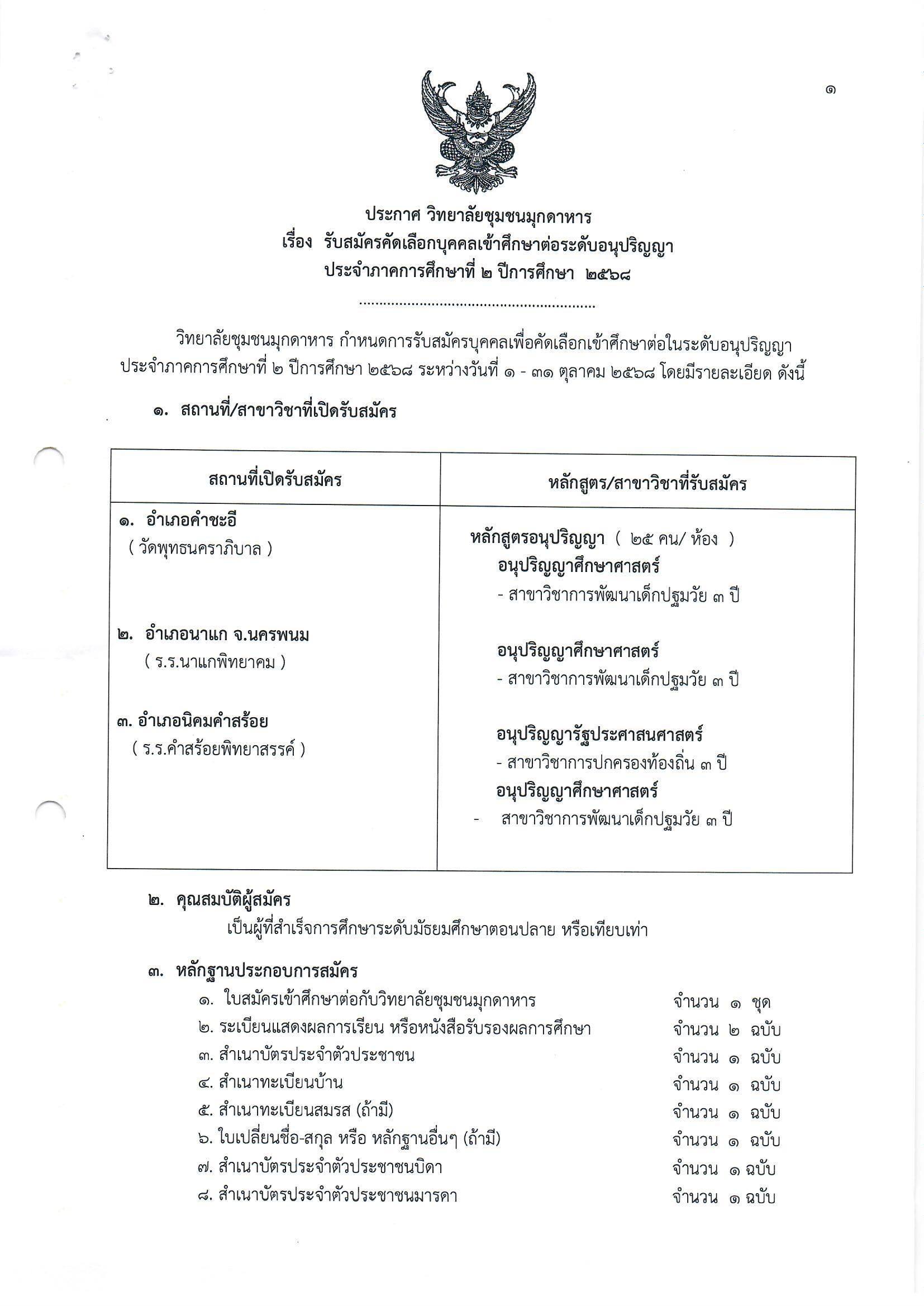 วิทยาลัยชุมชนมุกดาหาร รับนักศึกษาเข้าศึกษาต่อหลักสูตรอนุปริญญา ภาคการศึกษาที่ 2/2568 จำนวน 2 หลักสูตร ได้แก่ หลักสูตรอนุปริญญาศึกษาศาสตร์ สาขาวิชาการพัฒนาเด็กปฐมวัย และ อนุปริญญารัฐประศาสนศาสตร์ สาขาวิชาการปกครองท้องถิ่น ระหว่างวันที่ 1-31 ตุลาคม 2568